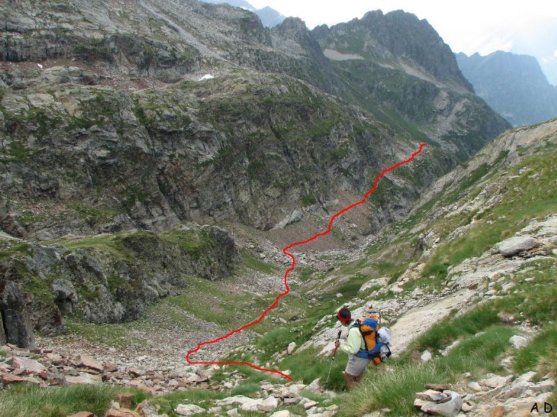 Sous le lac des Isclots, le chemin plonge dans un vallon et file