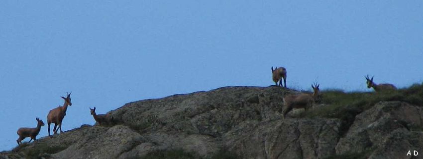 Sur le haut d'une barre, à 100m, en cette fin de journée, une harde d'isards nous observe.