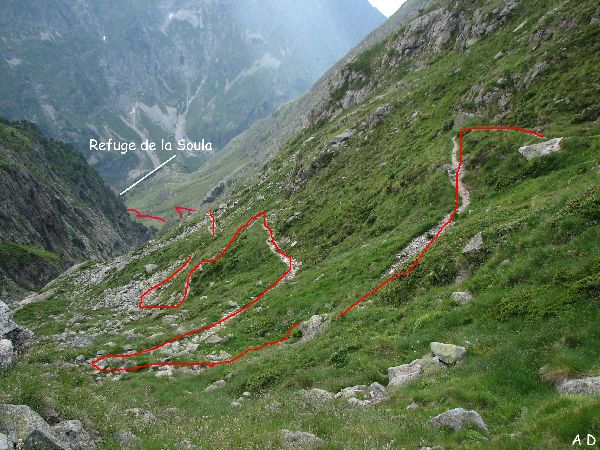 et le sentier plonge en zigzag vers le refuge de la Soula.