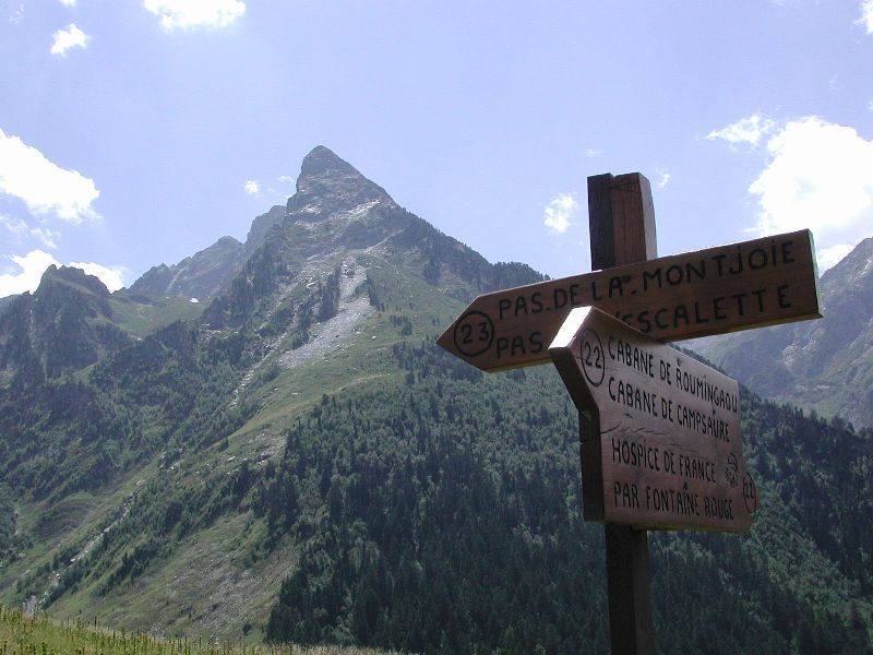 Sous les contres fort du pic de la Mine, le panneau directionnel "Hospice de France
