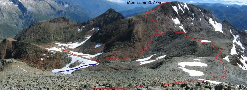 Le Montcalm et une bonne partie de l'itinéraire de montée (Cliquez pour retirer la légende)