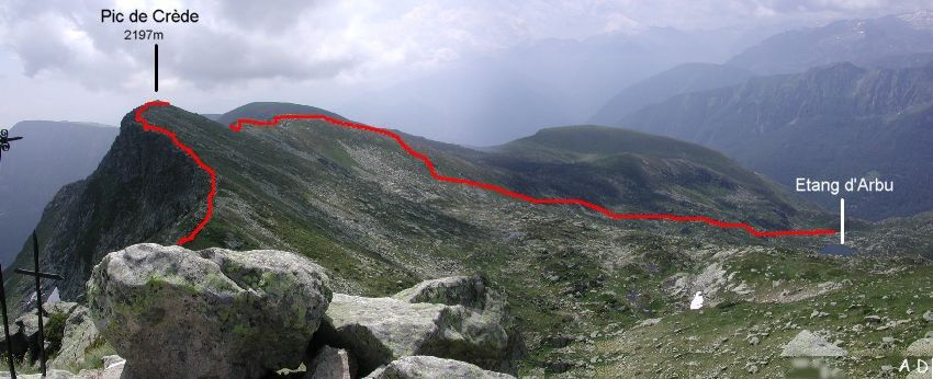 Itinéraire de montée, Pic de la Crède, en bas, l'étang d'Arbu