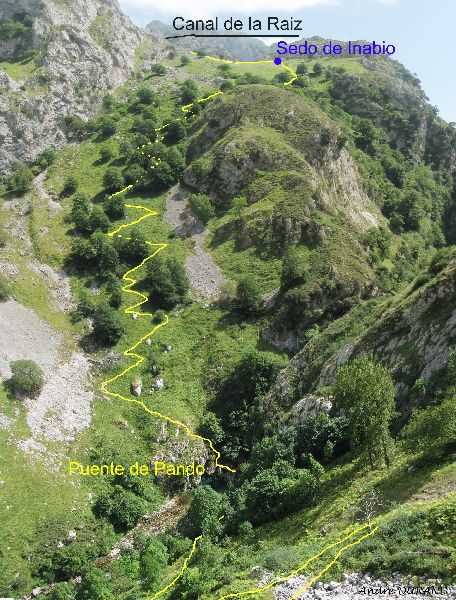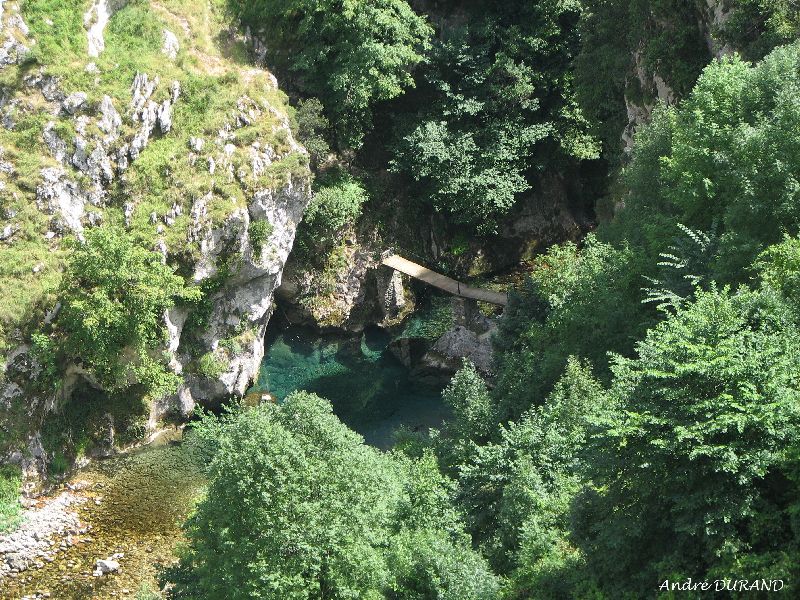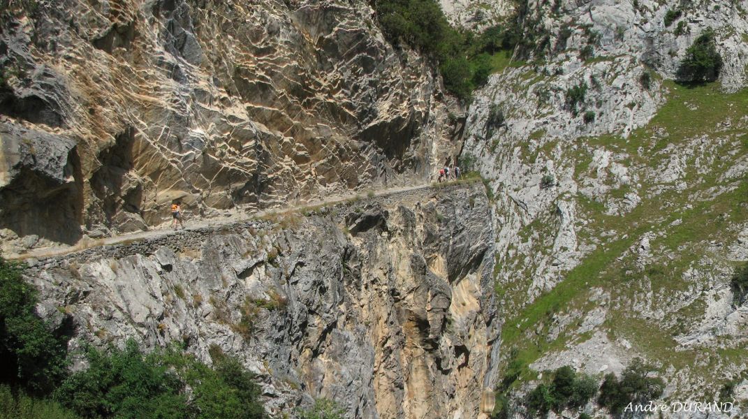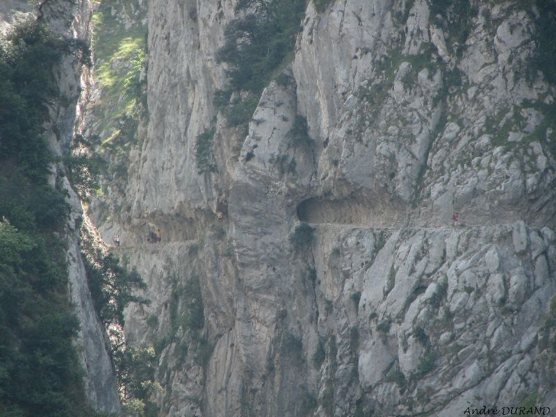 Depuis le chemin de Cares, le "Puente Pando" 110m plus bas et au dessus l'itinéraire de descente de la cabane "Sedo Inabio".