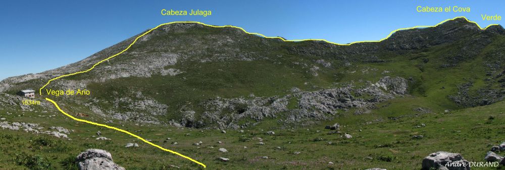Plateau de Vega de Ario avec le refuge du Marqués de Villaviciosa ou de Vega de Ario 1634m dominé par les modestes sommets de Cabeza Julaga 1720m, Cabeza el Corvu 1710m, et Cabeza de Verde 1719m qui se parcourent par une crête facile.