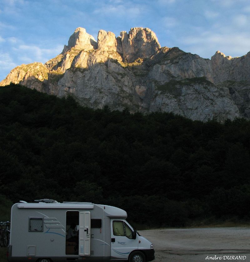 Parking de Fuente Dé. avec le lever du soleil sur les aiguilles de Remoña