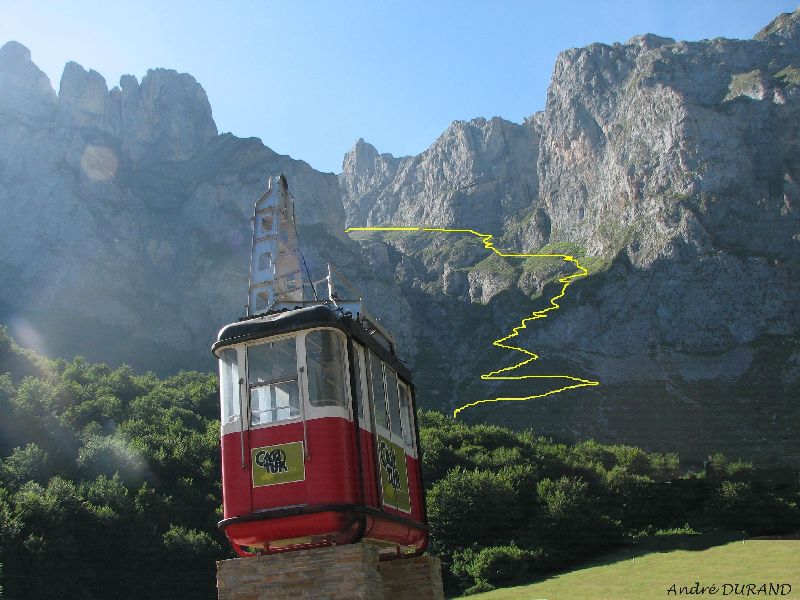 Ancienne cabine du téléférique avec en arrière plan le sentier du col de Liordes accroché au paroi du pic de Padierna.