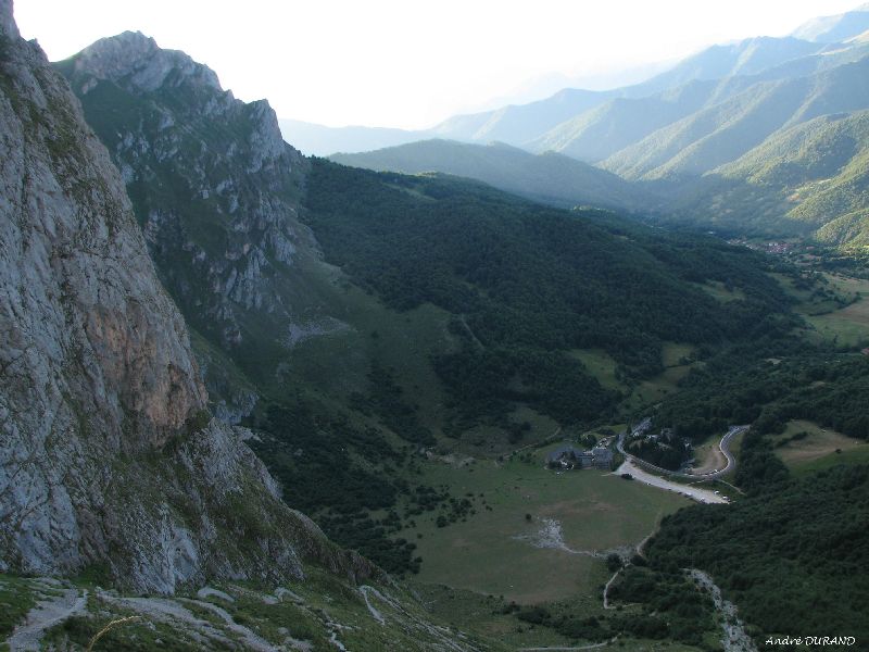 Le sentier qui monte sèchement avec en fond le parking de Fuente Dé et la boucle de la route.