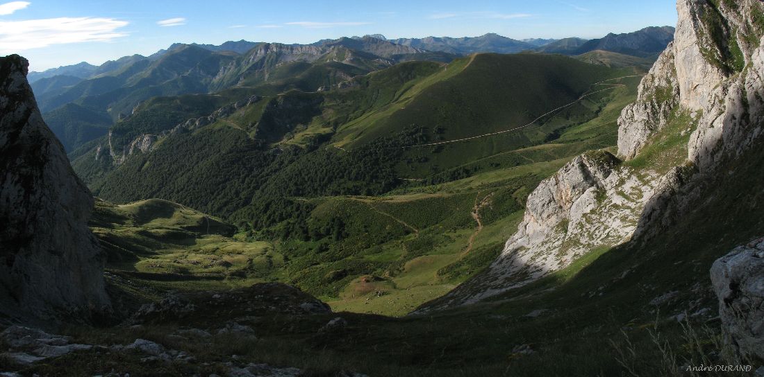 Du col de Remoña, un vallon boisé aux formes arrondies vous attends, mais avant le chemin plonge vers la cabane au toit rouge que l'on devine en contrebas sur le mamelon brun..