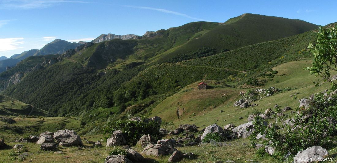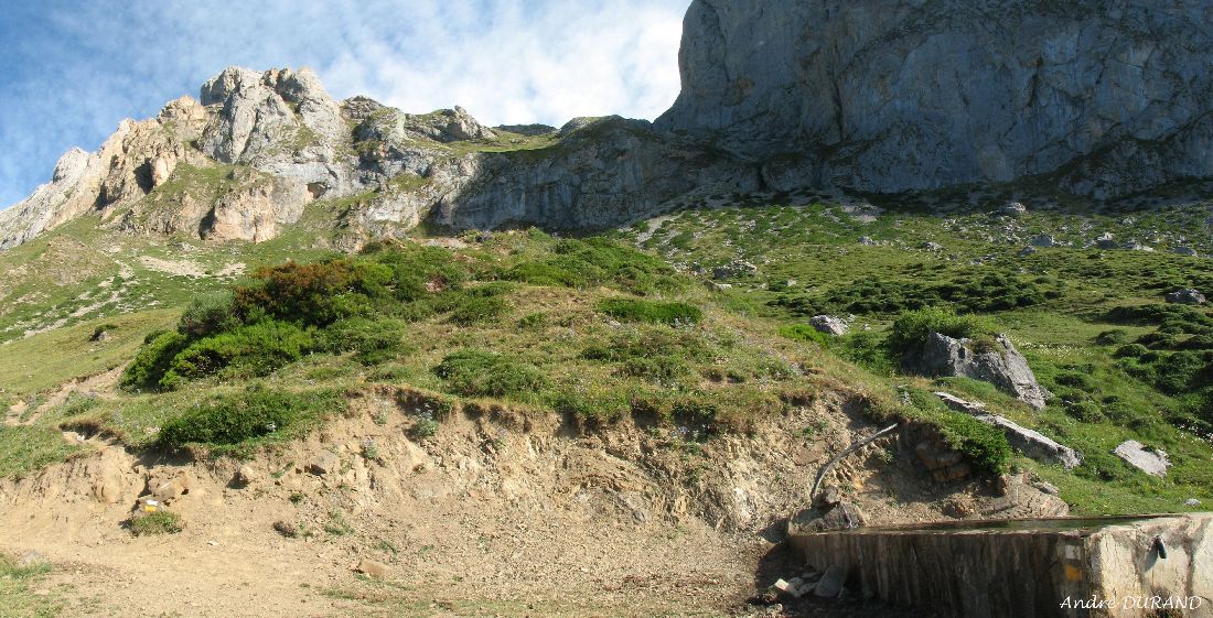 Fuente de Pedabejo (Fontaine de Pedabejo) avec le col de Remoņa 2008m au dessus de la barre rocheuse que'il faut franchir.