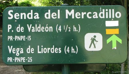 Au terminus de la piste, le panneau indique les temps de Vega de Liordes dans le sens inverse