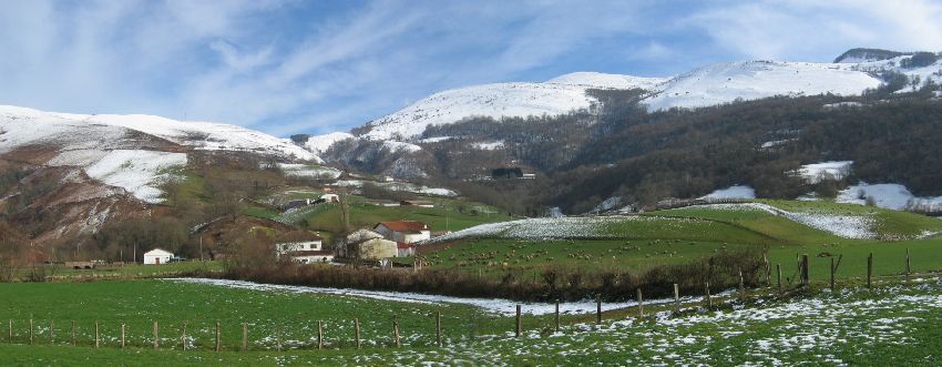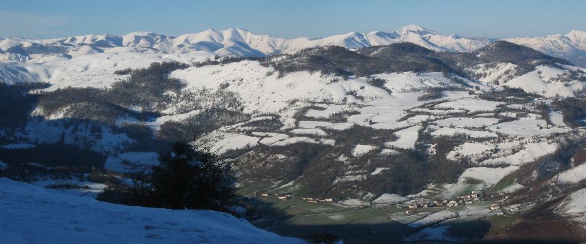 En bas le village de Hosta sort de l'ombre, en haut le pic de Hautza.